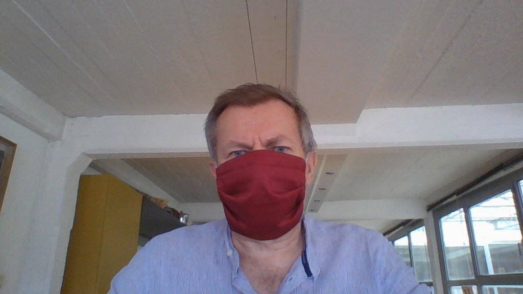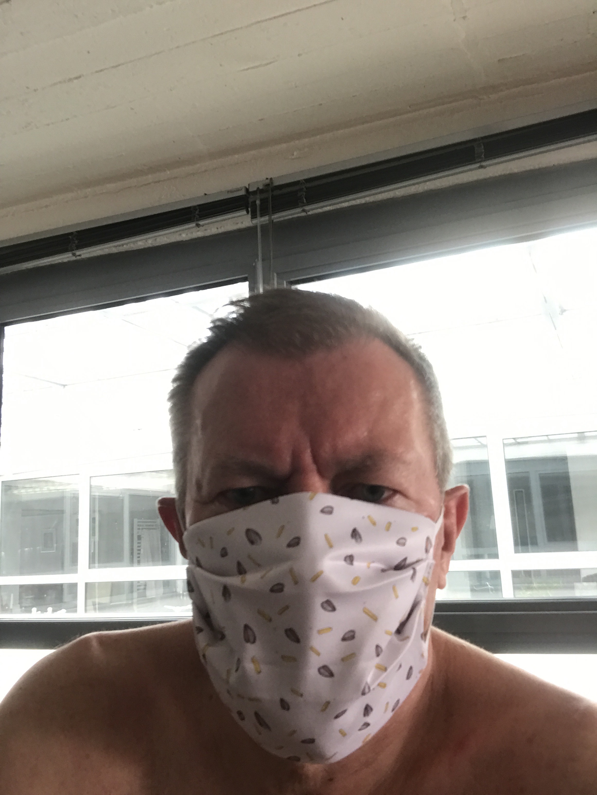 Engångsmaskerna blir svettsamlingar alltför fort. Det blir en blöt gegga vid munnen. Så in till öl- och babyklädsbutiken där de har tvättbara tygmasker med musslor och pommes frites motiv. Fast jag påstod att det var kaffebönor men expediten vägrade gå med på det.