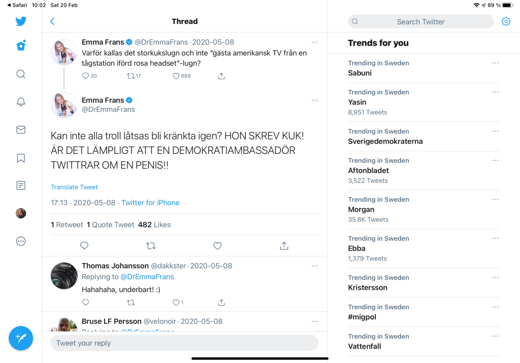 Och definitivt är inte Ulla och Birgit och Eva på hemmakontoret hobbyepidemiologer. De berättade glatt om hur de hade skrattat (fast med lite skamsenhet) när de hörde om var skorpionen hade träffat sitt mål. Ingen hysteri där inte.