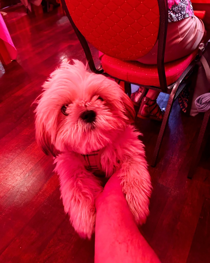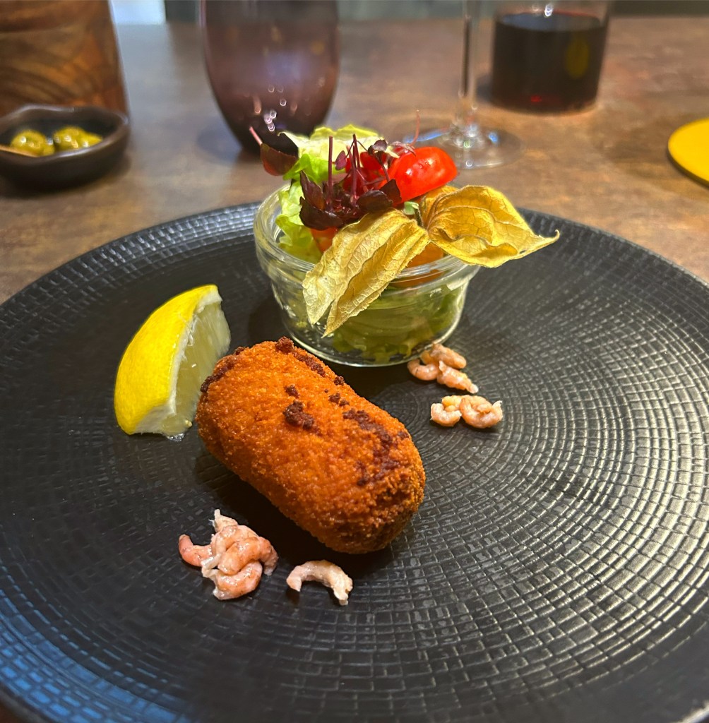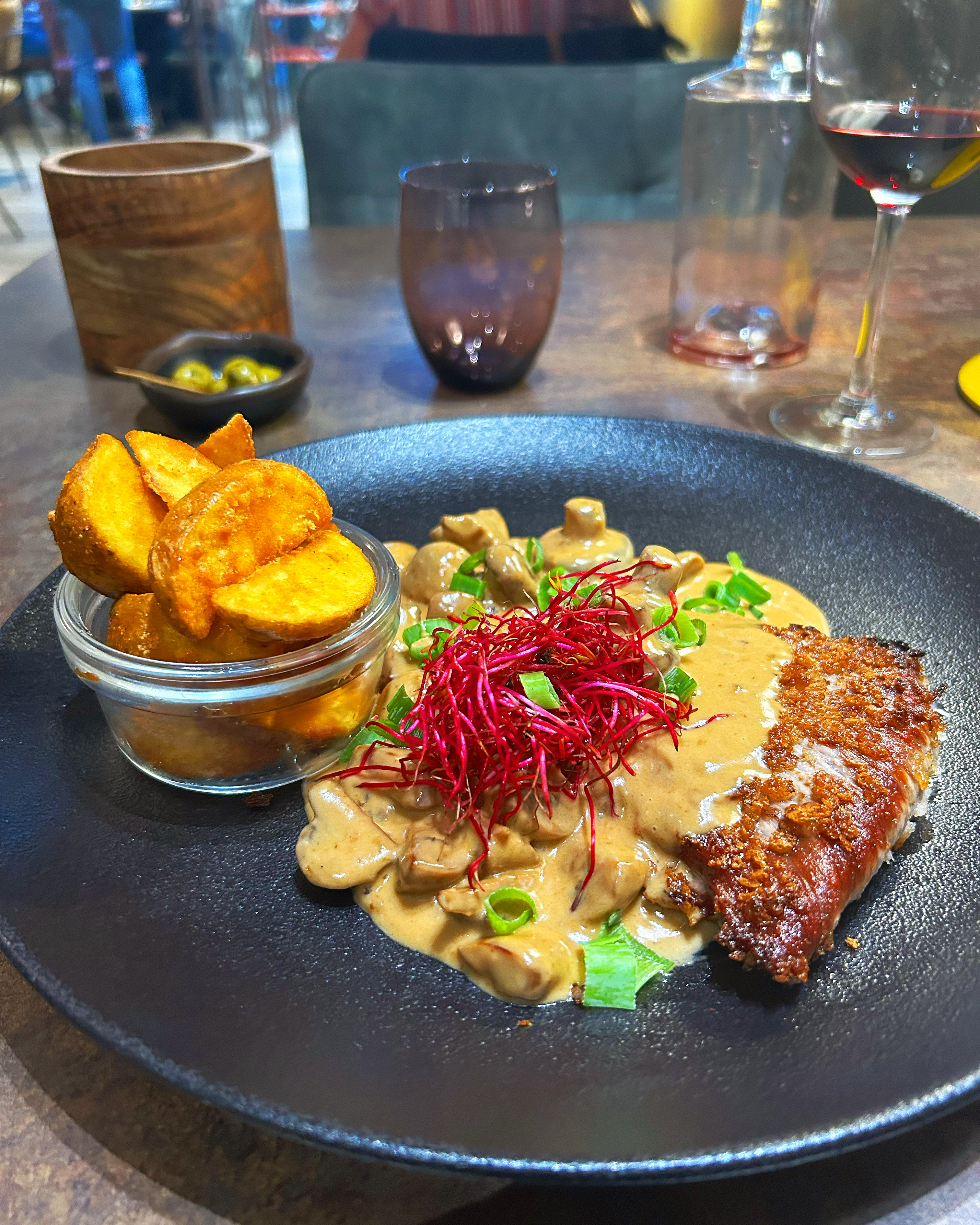 Men detta är perfekt. Jag blir kär. I räkorna som plaskar i en gräddsås. I ungtuppen. (Igen) Som plaskar i grädd- champinjonsås. Det är helt brilliant. Och när lille Tango vid bordet bredvid ser mig och vill bli kliad så är lyckan förstärkt. Konjaken hjälper till.