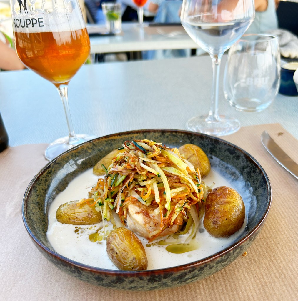 Ramler nerför berget. Vill inte svindla med kabelbanan en gång till. Den var svettig. Och tur är det att jag ramlar ner för då hamnar jag på båten. Restaurangbåten. Cote Meuse. Och jag kommer rätt i tid, En halvtimme innan firmafesten – för det går inte fort med en kock och en servitör. Men cevichen är fantastisk. Smaken sitter kvar länge. Ungtuppen är perfekt. Jag rullar nerför landgången.