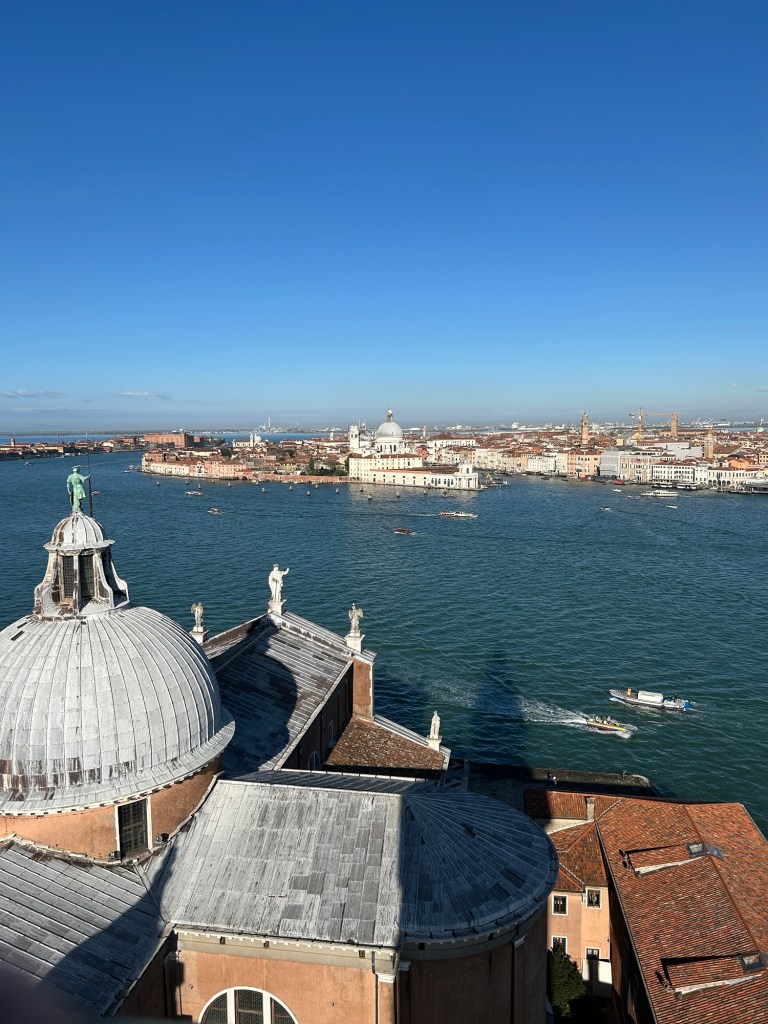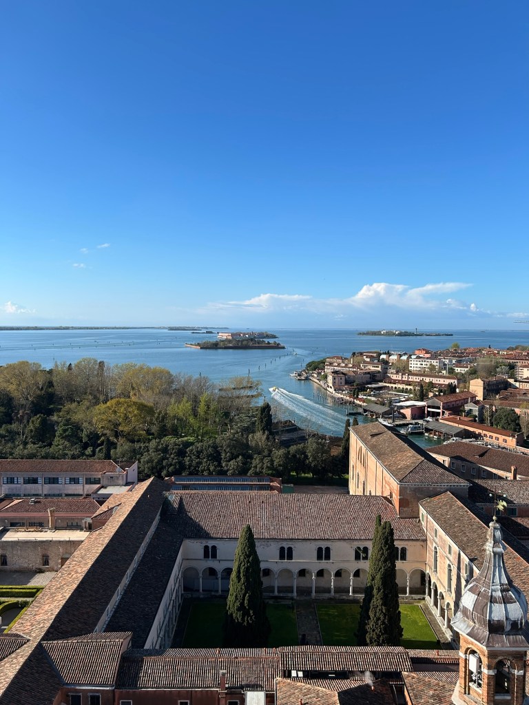 Utsikt. Upp i en klockstapel och peka mot vart vi ska. Öarna. Bort mot fjärran. Förbi Lido.