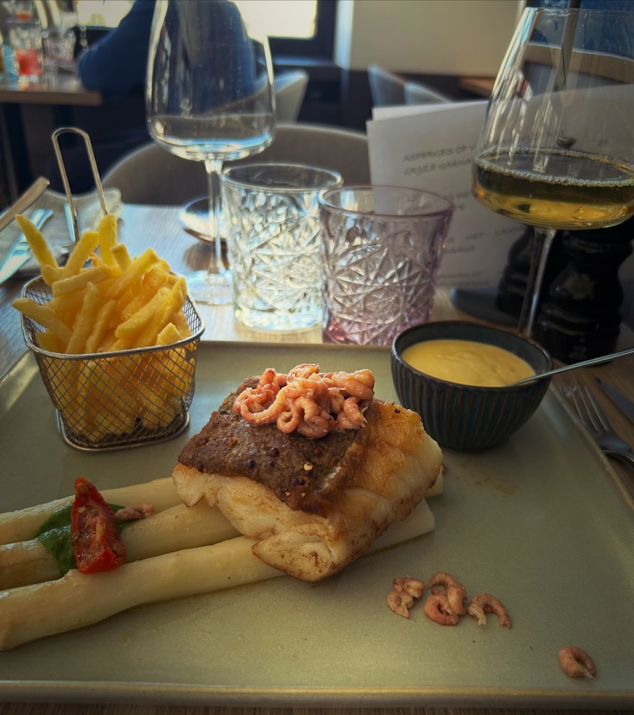 Jag letar efter restaurangen där jag för 3 år sedan åt god mat. Den är stängd. Jag väljer i stället det nyöppnade Steven. Där har sparrissäsongen startat. Det blir torsk. Med sparris.