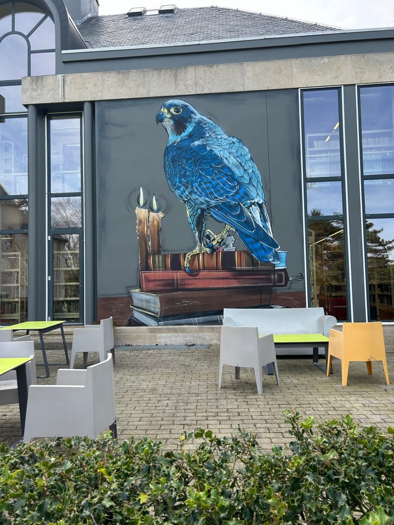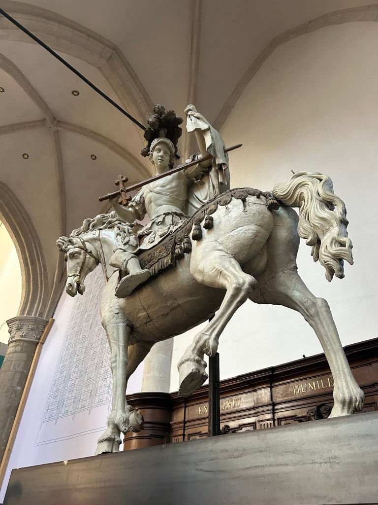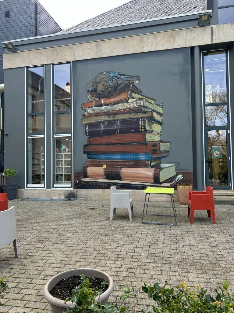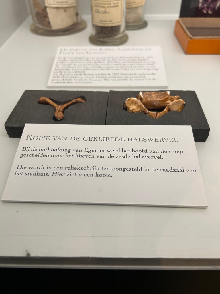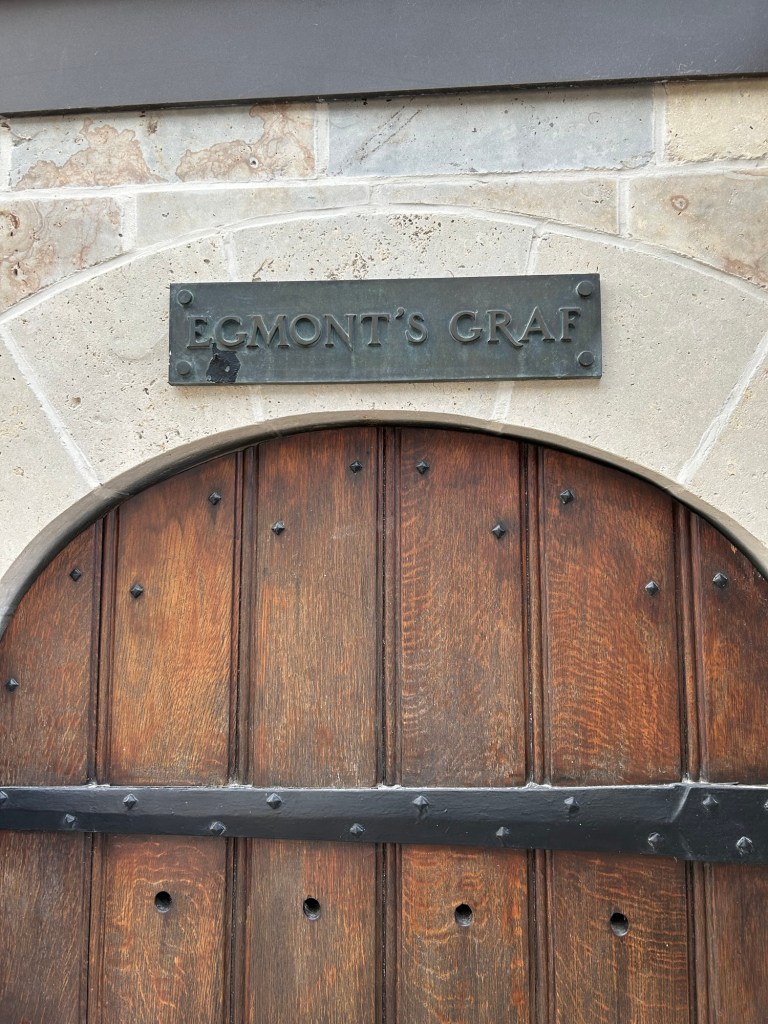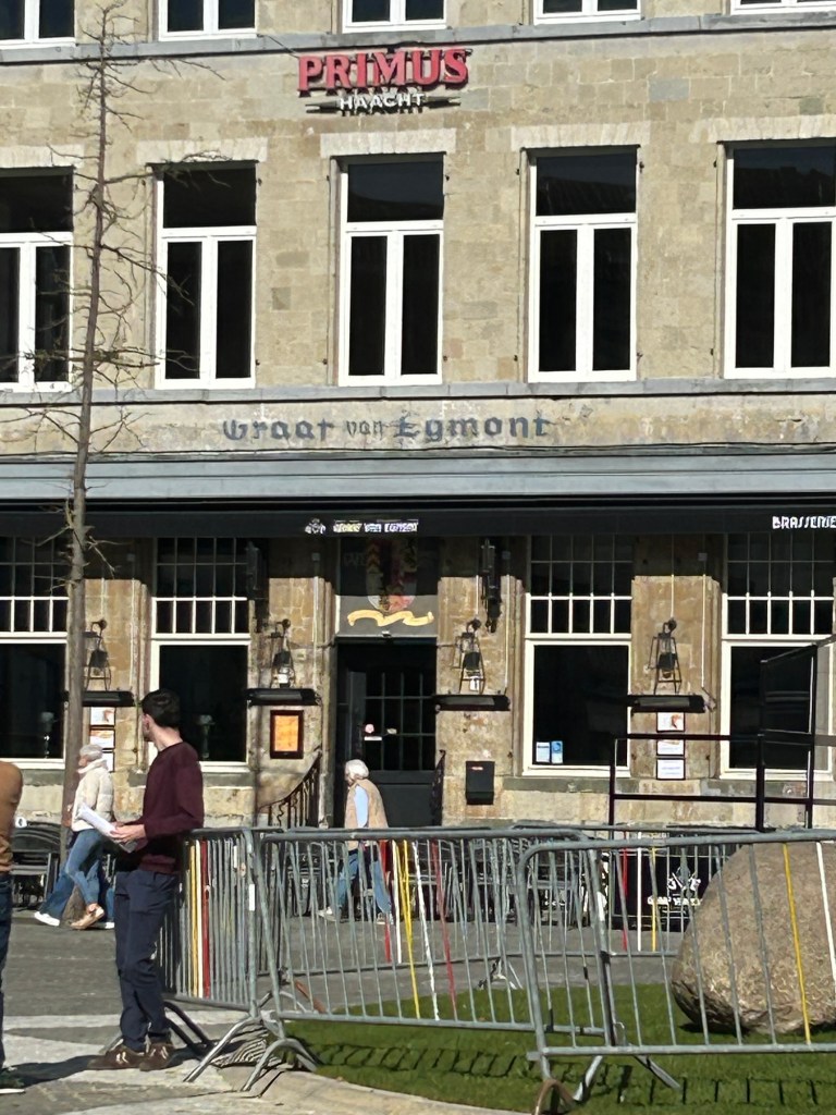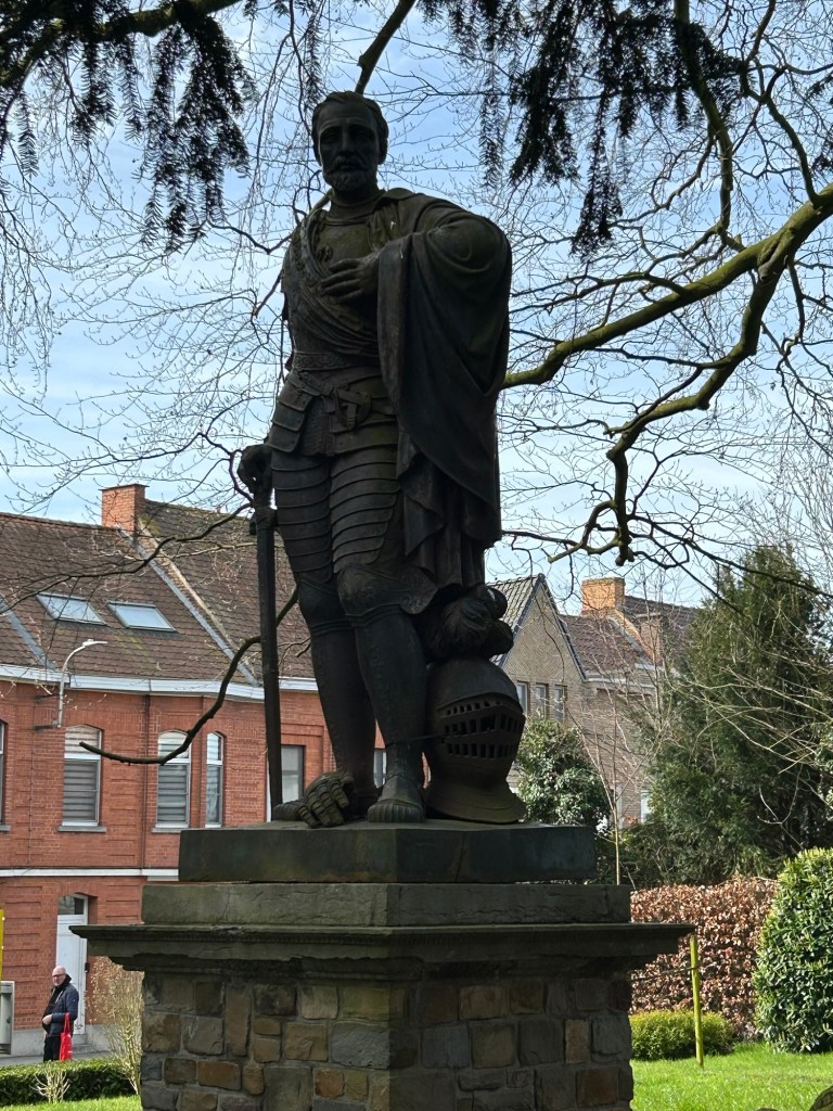 Egmont blev halshuggen i Bryssel. Han var för snäll mot protestanterna tyckte spanjoren och högg av huvudet på honom. Men Egmont finns överallt i stan. Slottet – nu bibliotek. Statyer lite här och var med honom.