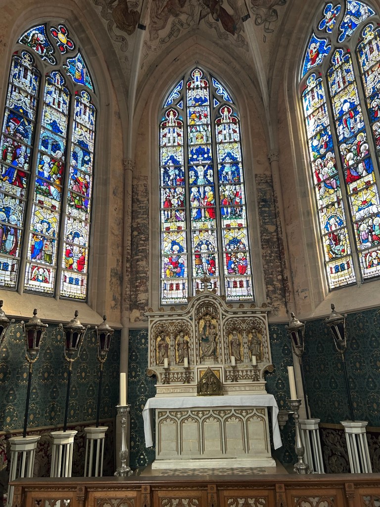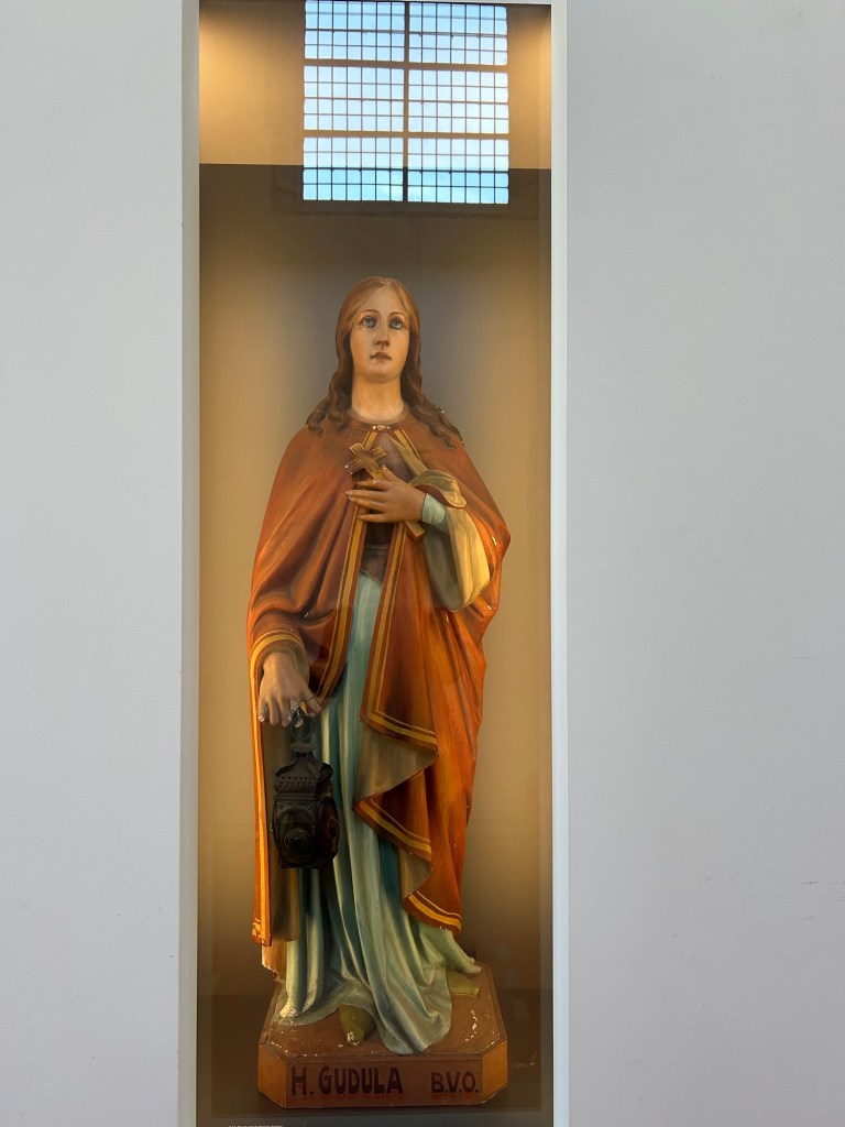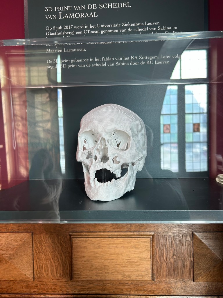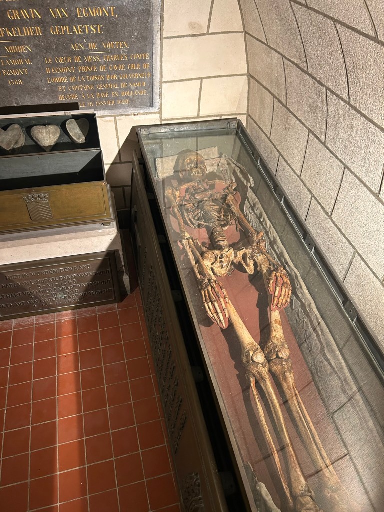 Jag tänkte egentligen åka till Schellebelle för att orten heter … Schellebelle. Men en googling efter sevärdheter där säger att det finns inget sevärt i Schellebelle. Om de inte visar filmen Schellebelle 1919 – en film som gjordes av lokalinvånarna. Filmen visas inte. Så jag åker inte dit. Men till Zottegem. Där finns inget museum. Men ett rum om greve Egmont. Mannen och frun är begravda i varsin glaskista i en krypta som är låst men där en dam från stadshuset har nyckel och leder mig över torget till kryptan.