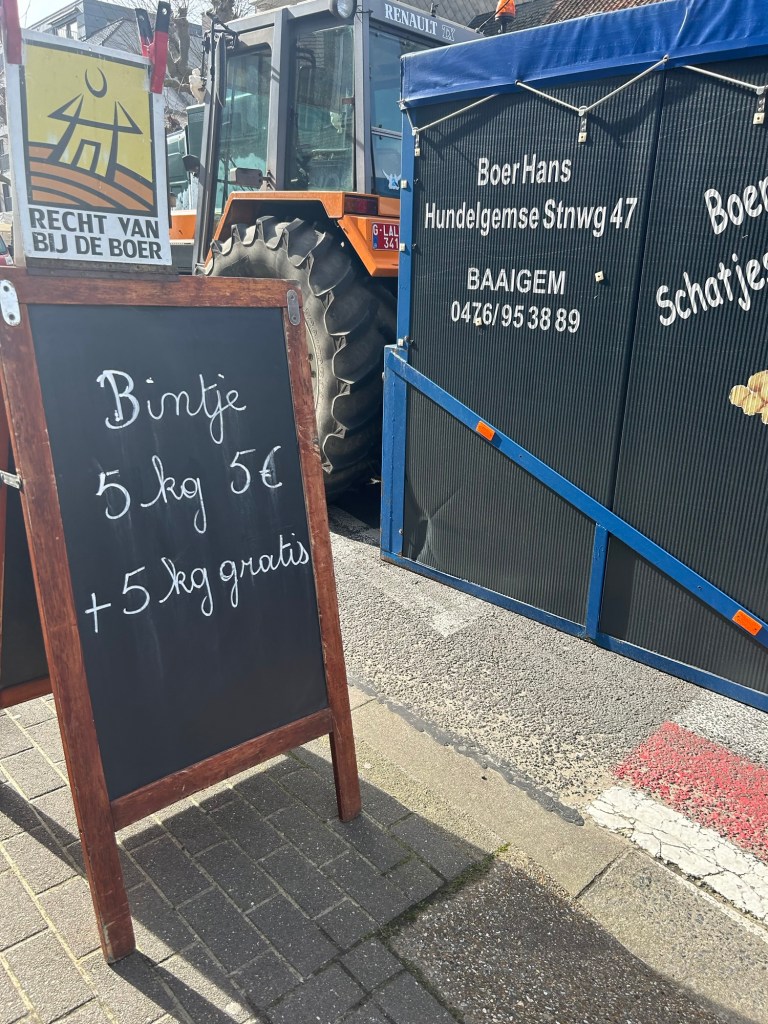 Mat. Liv. Där är det marknadsmeny. Ja – tisdagar är marknadsdagar. Bonden Hans säljer bintje för 5 euro for 5 kilo – och så får man extra 5 kilo på köpet.