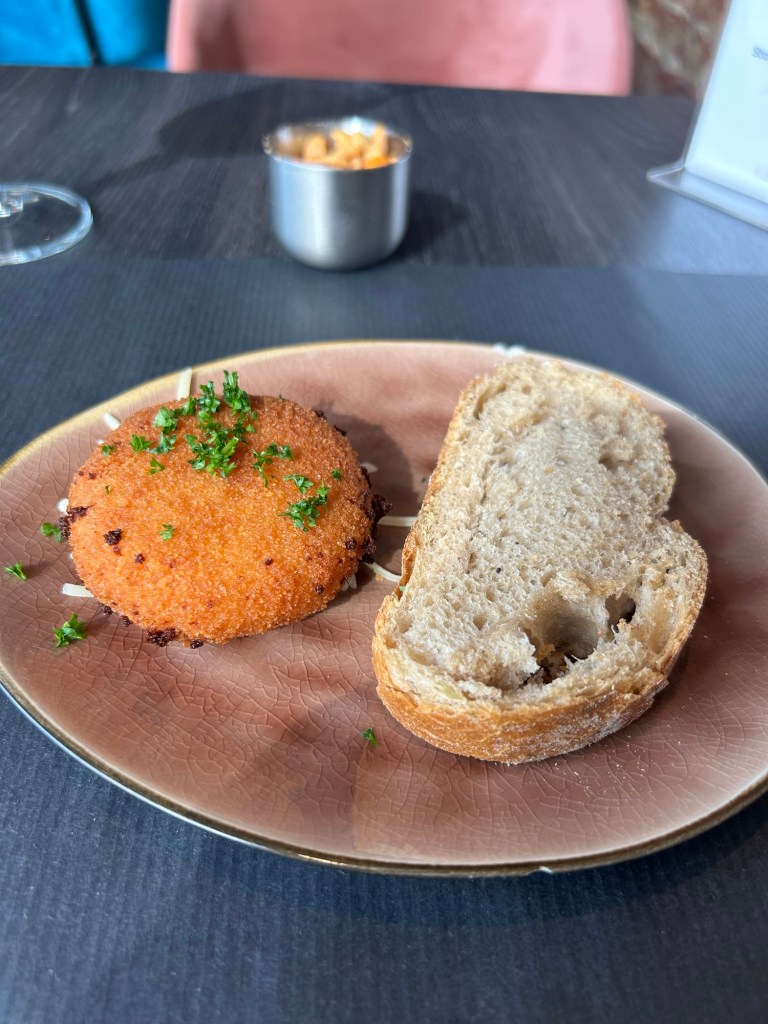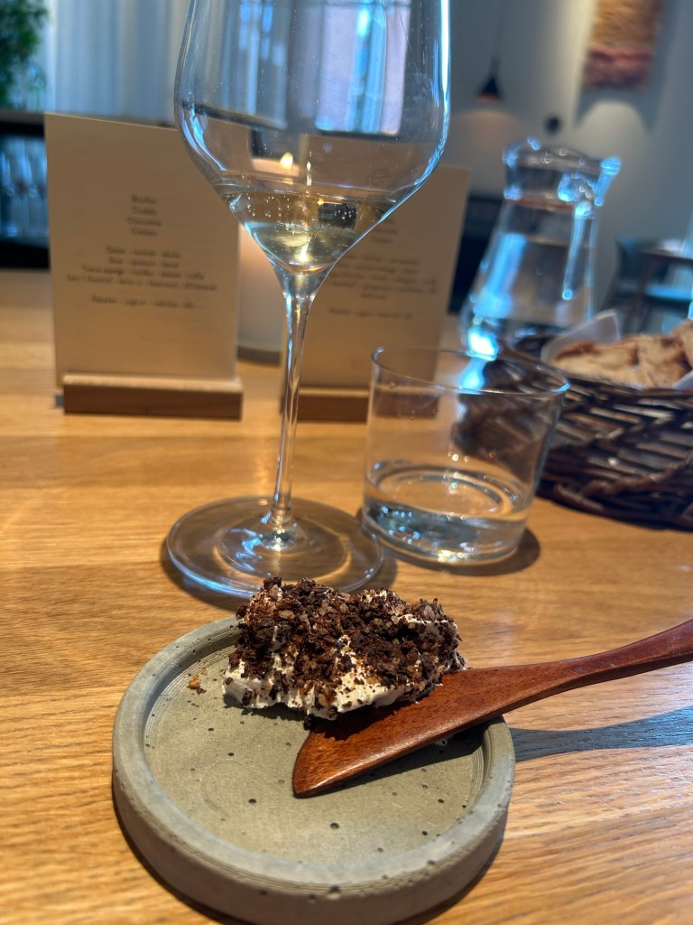 Det är trångt mellan borden för det är en liten lokal. Så trångt så min bakdel river ner en gaffel från bordet när jag ska klämma mig fram.