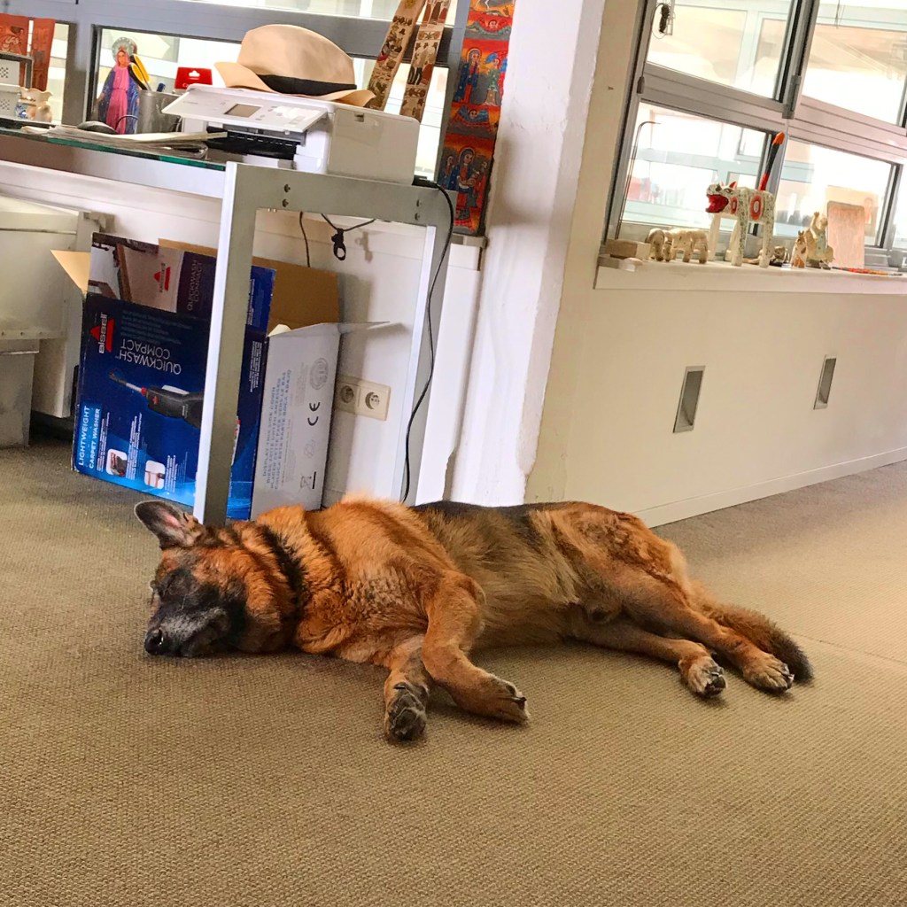 Idag en dag senare efter en lugn picnic i Roi Baudoin-parken såg jag en gammal St Bernhard – tror jag det är – som tog 5 steg – vilade en stund- tog 5 steg igen – och vilade. Det såg plågsamt ut. Tills vi kom nära. Och såg hundens nyfikna vakna blick. Insupandes allt. Totalt allt.